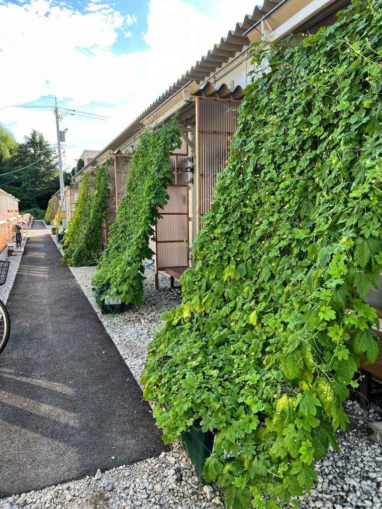 近年では、エアコンの消費電力抑制効果に着目し、1992年より中部電力さんが緑のカーテンキャンペーンを開始し、積極的な啓蒙活動をなされています。