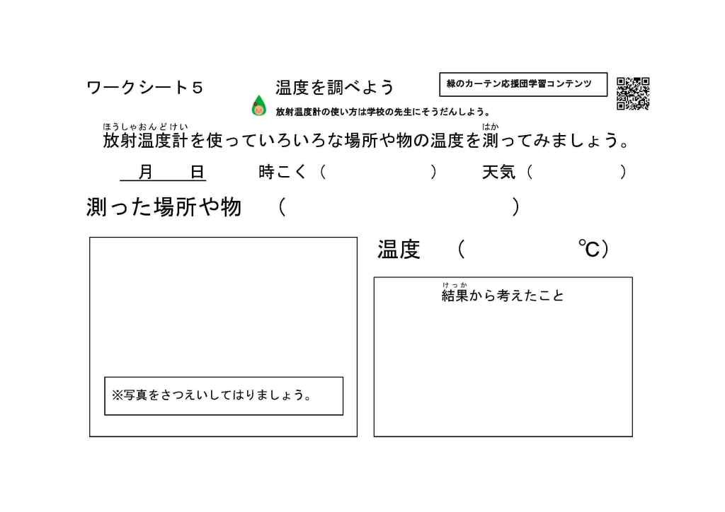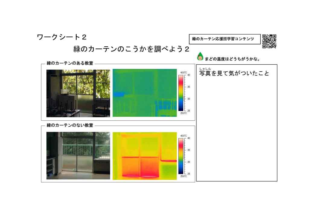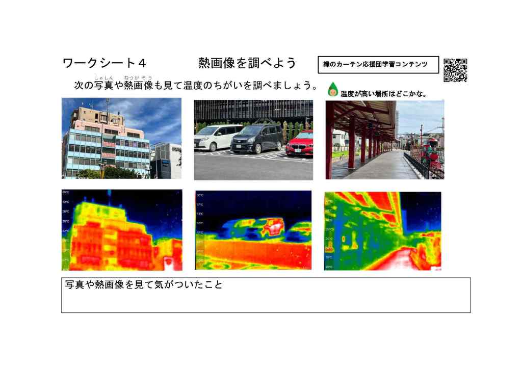 夏の暑さはひざしだけではなく、建物や道路が温まった熱からも感じられます。緑のカーテンがある場所とない場所の熱画像や温度グラフから緑のカーテンの効果について考えさせてください。また、ワークシートを活用して、温熱環境を体感的に学習する機会としてください。ワークシート1から6をご活用ください。